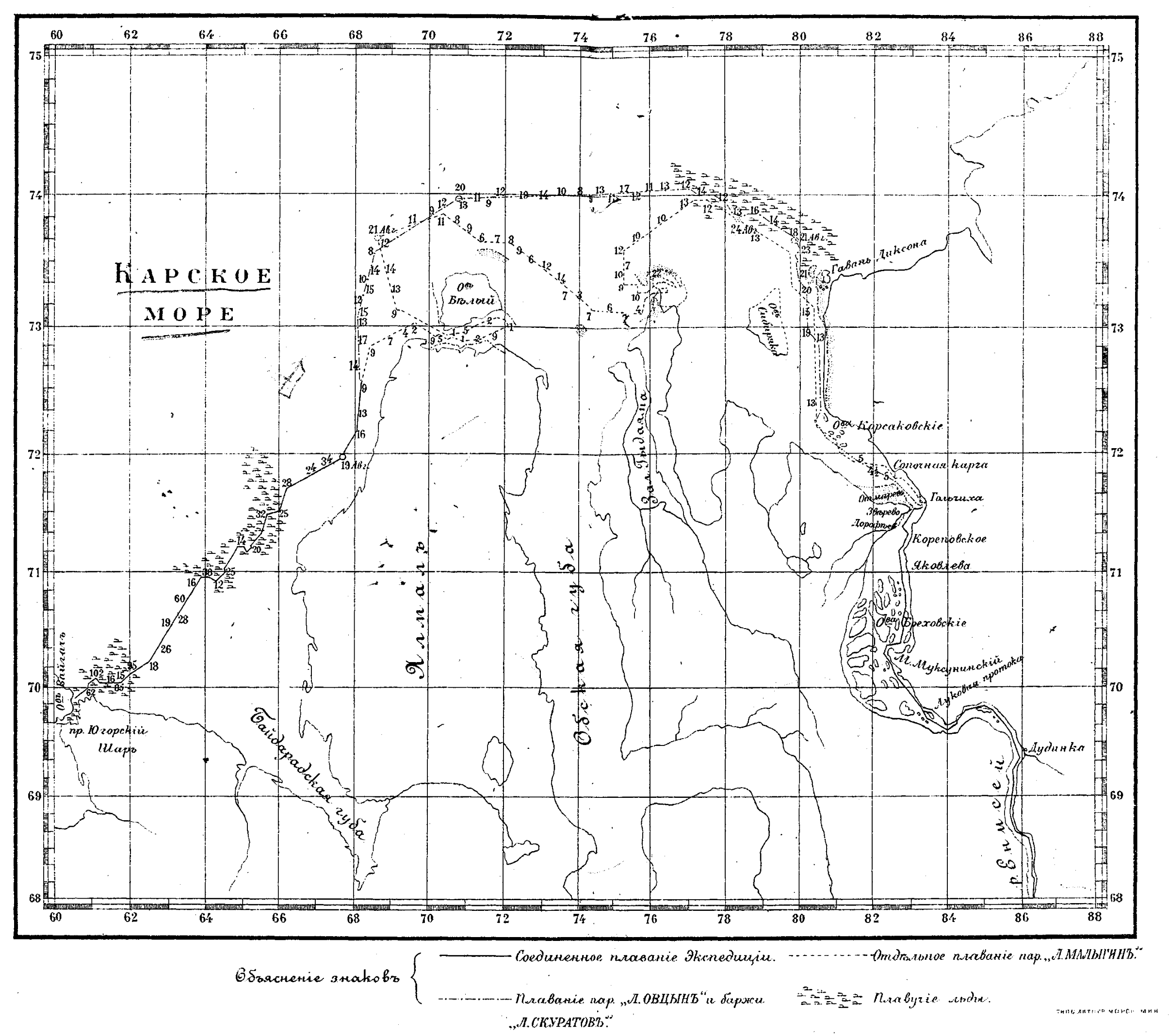 Значитъ, и спорить нечего. Отдали одинъ якорь, потомъ другой — дрейфуетъ. Якоря тащитъ по дну; носъ парохода весь дрожитъ; канаты вытянулись и гудятъ, какъ басовыя струны. Готовились уже отдать верпъ, но въ это время задержались. Глубина 5 саженъ; теченіе 4 ¼ узла (7 ½ верстъ). Хорошо, что стали. Темь наступала непроглядная. Ночь прошла безпокойно. Обыкновенно опредѣляютъ, дрейфуетъ судно или нѣтъ, по лоту, спущенному на дно, но при теченіи 4 ¼ узла мы были лишены этого простаго и удобнаго способа — давленіемъ воды на линь лотъ «выносило». Замѣнили тросовый линь проволокой, лотъ трехъ пудовымъ грузомъ — безуспѣшно. Оставалось одно — слушать, не гудятъ ли канаты. Къ счастью послѣ полночи вѣтеръ началъ стихать, а къ утру совсѣмъ заштилѣло. Чуть забрезжилъ разсвѣтъ, снялись съ якоря. Въ 8 ½ часовъ утра подошли къ заводи, гдѣ нашли «Игнатьева», и стали тутъ же въ ожиданіи «Овцына», за которымъ отправился «Бардъ», взявъ съ собой Нестера.